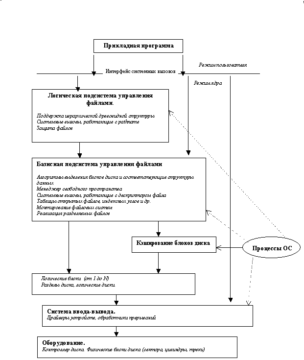 В структуре системы управления файлами можно выделить базисную подсистему, которая отвечает за выделение дискового пространства конкретным файлам, и более высокоуровневую логическую подсистему, которая использует структуру дерева директорий для предоставления модулю базисной подсистемы необходимой ей информации исходя из символического имени файла. Она также ответственна за авторизацию доступа к файлам (см. главу Безопасность ОС).