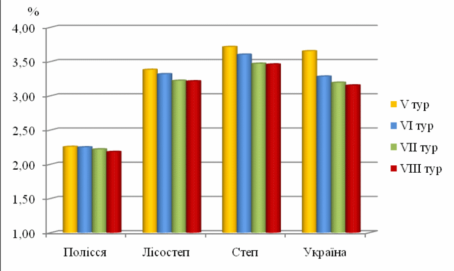 На жаль процеси дегуміфікації протягом останніх 20 років не зупинилися, а продовжують протікати з достатньо високою інтенсивністю. За результатами агрохімічної паспортизації земель сільськогосподарського призначення протягом останніх 4-х турів (1986-2005 рр.) уміст гумусу в Україні зменшився на 0,5 % в абсолютних одиницях (рис. 1).