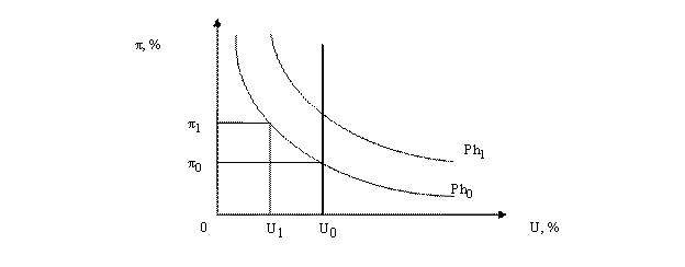 Во время разгона инфляционной болезни в целях ее излечения монетарные власти страны прибегают к мерам антиинфляционной политики, в результате чего темпы инфляции падают. Но на данном этапе проявляется другой экономический недуг – растет безработица. Такую взаимозависимость выявил английский финансист в 1950-х гг. А.Филлипс и отразил ее в кривой (рис. 1). Данный график иллюстрирует прямую зависимость между данными процессами – меры по снижению безработицы неминуемо вызывают инфляцию и рост цен, а наоборот, подавление инфляционного процесса снижает занятость населения.