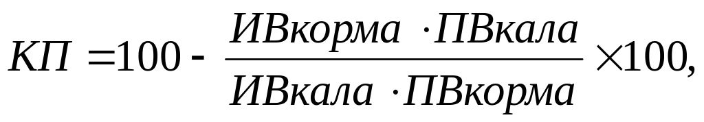 При проведении опыта по изучению переваримости с помощью инертных веществ отпадает необходимость учета выделенного кала, достаточно лишь знать его химический состав (в том числе содержание инертного вещества), а затем рассчитать коэффициенты переваримости питательных веществ по формуле