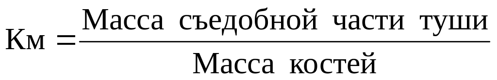 Коэффициент мясности – есть отношение съедобной части туши (масса мякотной части) к несъедобной (масса костей) и определяется по формуле: