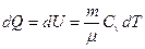 В изобарном процессе при сообщении газу массой m количества теплоты dQ=mCpdt /μ его внутренняя энергия возрастёт на величину dU = mCvdT /μ.