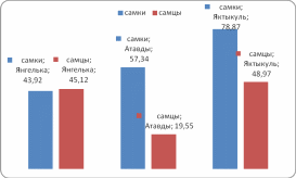 Отлов лягушек проводился на озере Атавды 10 самцов и 10 самок) и реке Янгелька 7 самцов и 8 самок) и на озере Яктыкуль (эталон) - 13 самок и 7 самцов.