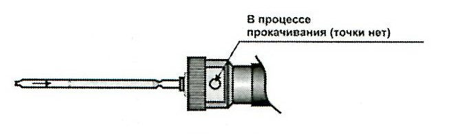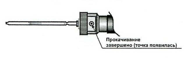 При уравнивании давления внутри цилиндра 2 с атмосферным давлением, мембрана возвращается в исходное положение. При этом в смотровом окошке появляется изображение черной точки, свидетельствующее об окончании просасывания пробы через индикаторную трубку. Агрессивные вещества, которые могут поступать в насос из воздуха через индикаторную трубку, адсорбируются наполнителем защитного патрона, помещенного в насадке.