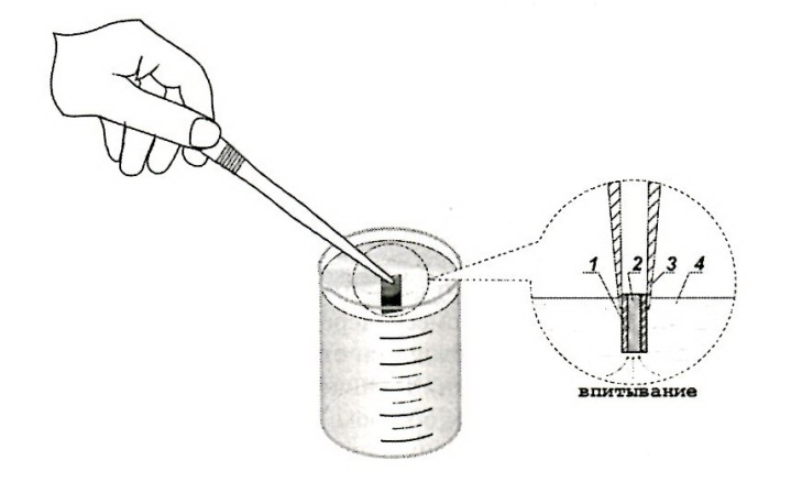 Рис. 6. Принцип действия тест-системы с полимерной защитой рабочего участка (1 - защитное полимерное покрытие; 2 - отрезок индикаторной полоски; 3 - пинцет; 4 -анализируемый раствор).