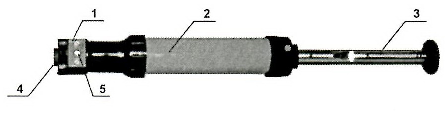 Рис. 2. Общий вид насоса-пробоотборника НП-3М (1 – насадка; 2 – цилиндр; 3 – шток; 4 – уплотнительная втулка; 5 – сигнальное устройство – индикатор завершения прососа).