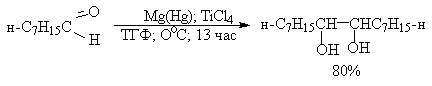 Классическим методом получения симметричных 1,2-диолов является восстановительная димеризация кетонов. В качестве восстановителей используют активные двухвалентные металлы - магний, цинк, амальгаму магния в апротонной неполярной среде - бензоле, толуоле, ТГФ. В первой стадии реакции кетон присоединяет один электрон и восстанавливается до анион-радикала, называемого кетилом. Димеризация двух анион-радикалов во второй стадии приводит к алкоголяту 1,2-диола, который затем гидролизуют до диола.