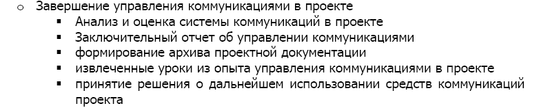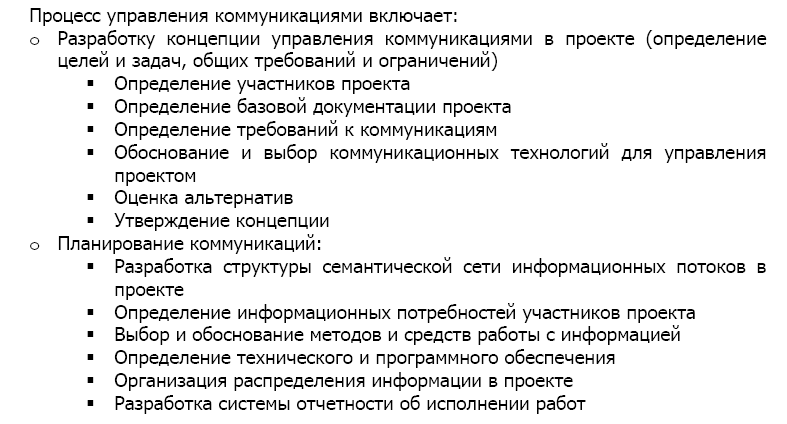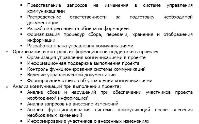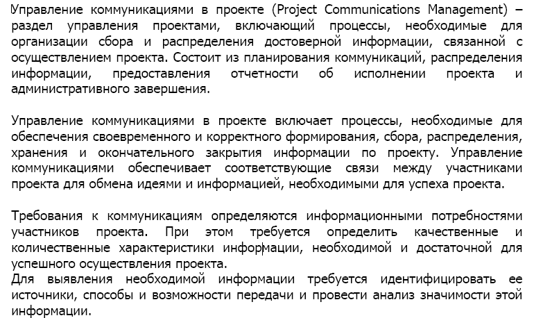 Коммуникации — это процессы, связанные с обеспечением своевременного и соответствующего формирования, сбора, распространения, хранения и окончательного размещения проектной информации.
