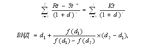Внутренняя норма доходности представляет собой норму дисконта (d), при которой величина приведенных эффектов равна приведенным капиталовложениям и определяется решением уравнения: Если определение ЧДД инвестиционного проекта дает ответ на вопрос, является ли он эффективным или нет при некоторой заданной норме дисконта (d), то ВНД проекта определяется в процессе расчета и затем сравнивается с требуемой инвестором нормой дохода на вкладываемый капитал. Значение дисконта для второго приближения находим из формулы: