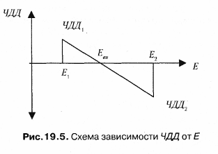 где ав и ан — коэффициенты наращивания потоков для верхнего и нижнего значений ставок доходности; а — коэффициент наращивания потока, для которого определяется размер ставки; iви iн— вернее и нижнее значение ставок доходности. Значение внутренней нормы доходности можно получит приближенно методом итераций. Схема зависимости ЧДД от Е показана на рис. 19.5.