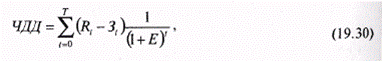 где Rt— результаты, достигаемые на t-м шаге расчета; Зt — затраты, осуществляемые на том же шаге; Т —горизонт планирования, расчета (равный номеру шага расчета, на котором производится ликвидация объекта); Е — ставка доходности (норма дисконты); (Rt — Зt) = Эt — эффект, достигаемый на t-м шаге (аналог ЧД). Если же норма дисконта меняется во времени, то