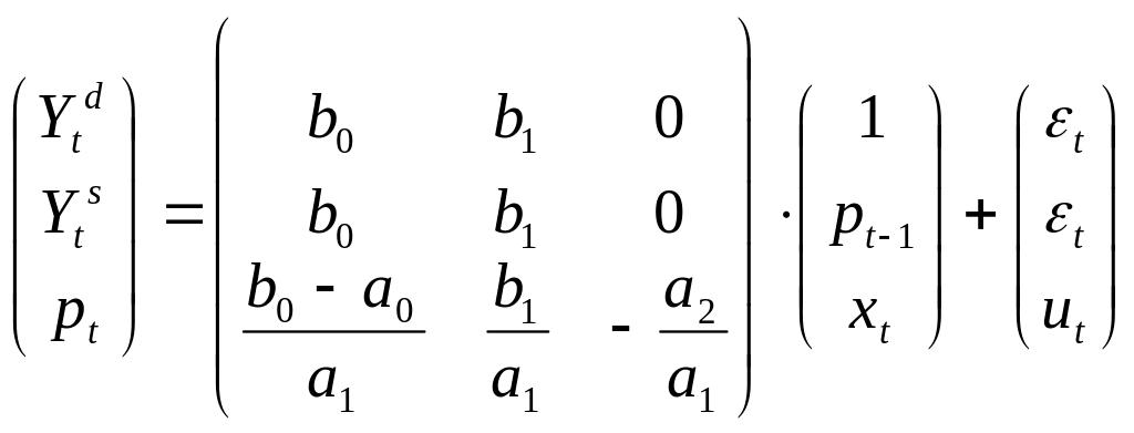 Представим спецификацию (1.17) модели равновесного рынка в форме (1.20). Для этого предварительно в каждом уравнении системы перенесем все члены (кроме случайных возмущений) в левую часть:
