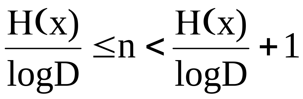 При заданном ансамбле Х из N сообщений с энтропией Н(х) и алфавитом, состоящем из D символов, возможно так закодировать сообщения ансамбля посредством последовательности символов, принадлежащих заданному алфавиту, что среднее число символов на сообщение n удовлетворяет неравенству: