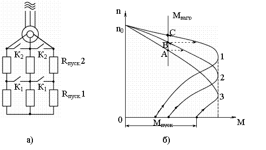 На рис. 2.19 приведена схема реостатного пуска (рис. 2.19.а) и механические характеристики (рис 2.19.б) при этом пуске.