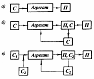 У комбінованих процесах основна сировина (С1) може перетворюватись на продукцію (П) за один цикл перебування в агрегаті, а допоміжна сировина (С2) використовується багаторазово (рис. 3, в).