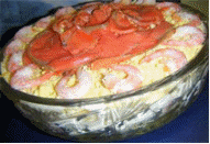 Слои через один или два - промазываем майонезом. Украшаем сверху креветками и розочкой из нарезки красной рыбы, и даем пропитаться.