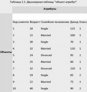 По горизонтали таблицы располагаются атрибуты объекта или его признаки. По вертикали таблицы - объекты.