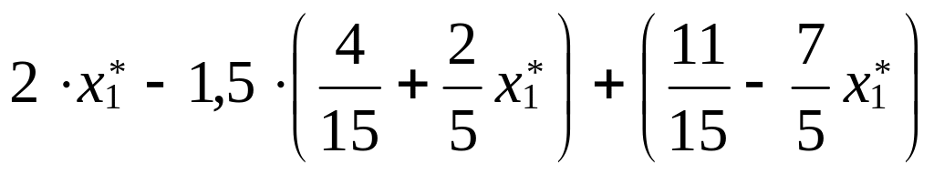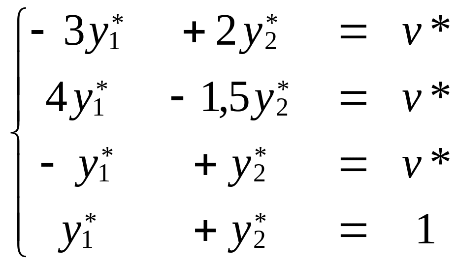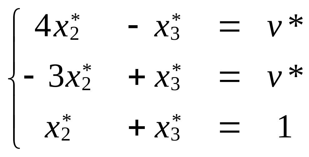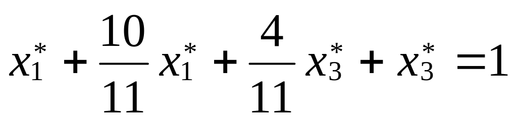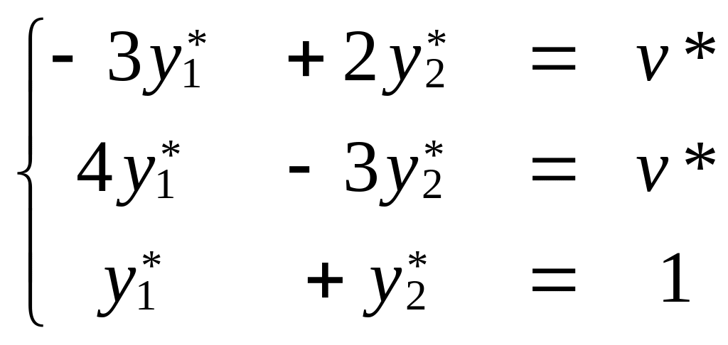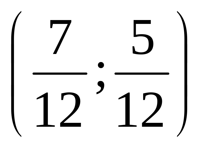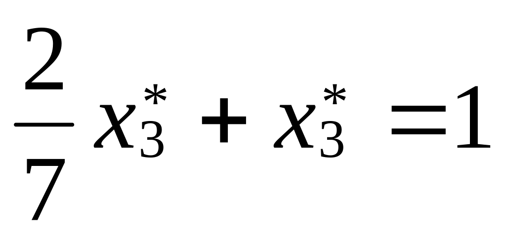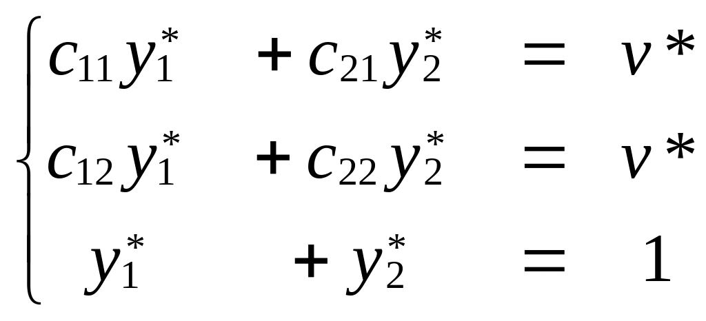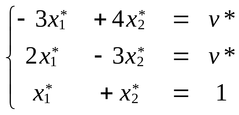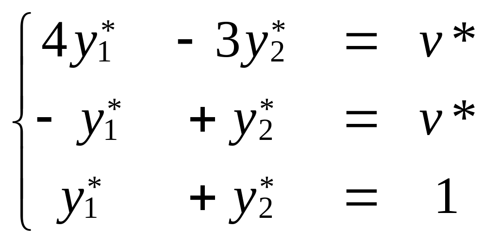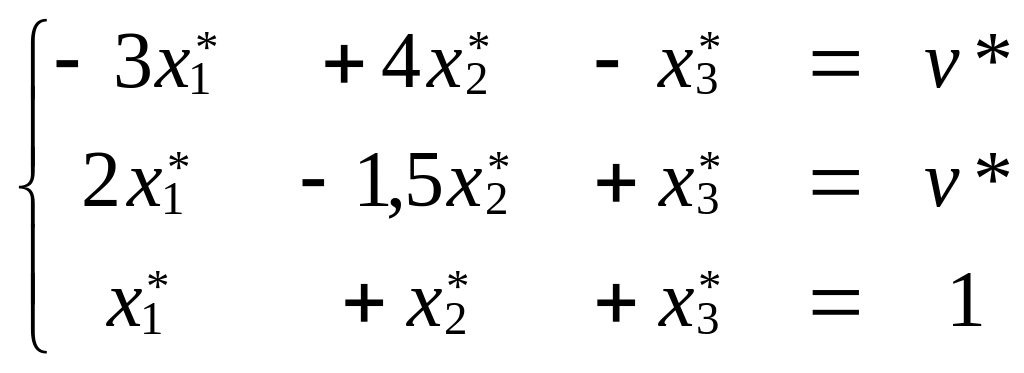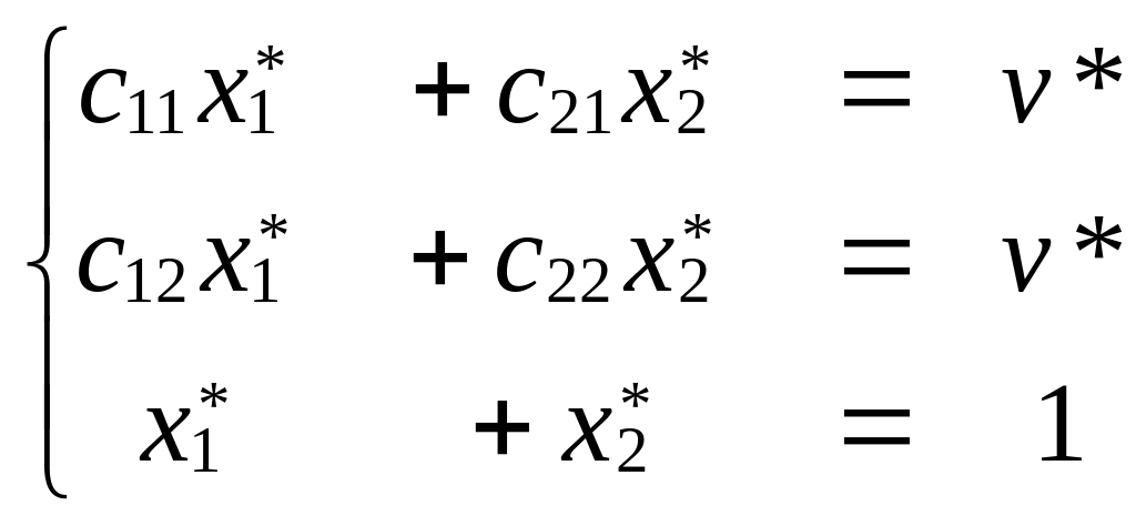 Найдём оптимальную стратегию игрока А. Составляем систему уравнений для активных стратегий игрока В, предполагая, что выигрыш игрока А по активным стратегиям игрока В равняется наибольшему гарантированному выигрышу игрока А, цене игры . В систему уравнений добавляется условие нормировки, определяющее, что сумма вероятностей игрока А для его смешанной стратегии равняется единицы.