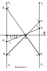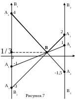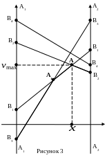 Решение. Строим график для определения выигрышей игрока А (рис. 7). На осях В1В1 и В2В2 отмечаем выигрыши игрока А. На оси В1В1 точки: А1 (–3), А2 (4), А3 (–1); на оси В2В2 точки: А1 (2),
