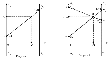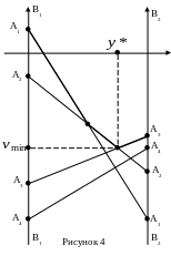 Также строится и отрезок для стратегии В2, который обозначим В2В2 (рис. 2). На нём будут лежать точки, определяющие выигрыши игрока для его смешанных стратеги, если игрок В выберет стратегию В2.