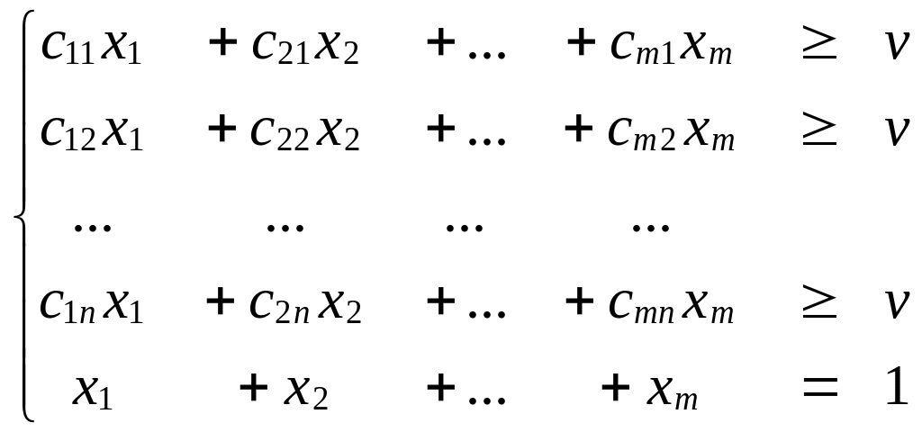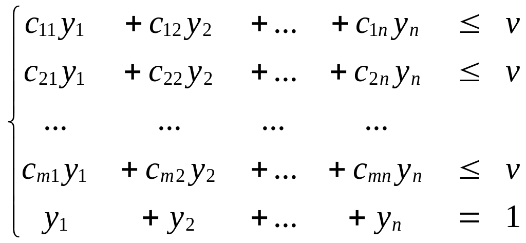 Таким образом, чтобы решить задачу линейно – программным способом, нужно проверить, все её элементы строго больше нуля или нет. Если есть отрицательные элементы, то нужно предварительно прибавить число , которое равняется наибольшему из модулей отрицательных элементов матричной игры плюс единица.