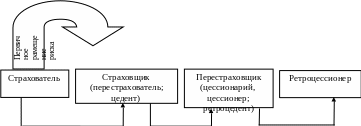 Процесс, связанный с передачей риска, называют цедированием риска или перестраховочной цессией. Страховщика, отдающего риск, называют цедентом, а принимающего - перестраховщиком, цессионером. На рис 1. представлена схема передачи страхового риска.