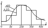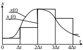 Реально восстановление непрерывного процесса по дискретным отсчетам производится фиксацией значений процесса на интервал дискретизации с последующей фильтрацией фильтром низкой частоты.