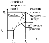 Видим, что при использовании этого метода используется линейная экстраполяция и тангенс угла наклона экстраполирующей прямой равен производной функции u(t) в точке А . Экстраполированное значение uk отличается от точного на величину ошибки.