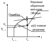 Неявный (обратный) метод Эйлера основан на разложении функции u(t) в ряд Тейлора в окрестности точки В(uk,, tk) (см. рис. 5.1 б):