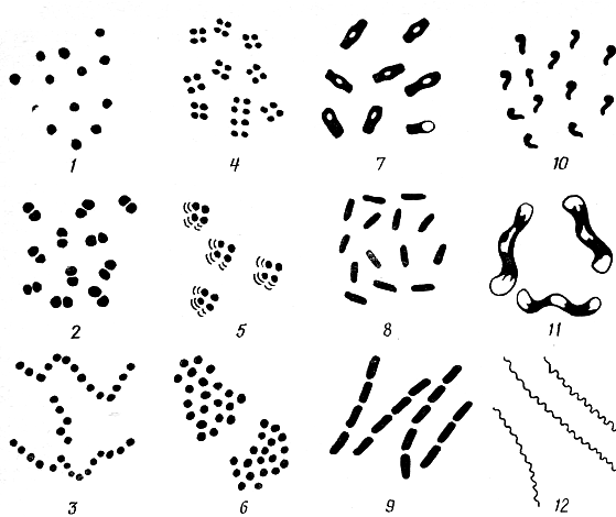 1 — микрококки; 2 — диплококки; 3 — стрептококки; 4 — тетракокки; 5 -сарцины; 6 — стафилококки; 7 — бациллы; 8 — бактерии; 9 — стрептобактерии; 10 — вибрионы; 11 — спириллы; 12 — спирохеты