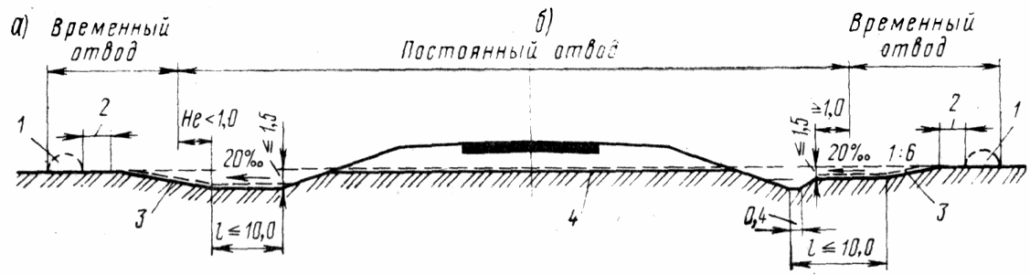 Рис. 8.8. Схема приведения резервов в состояние, пригодное для сельскохозяйственных работ: а – профиль с кюветами-резервами; б – профиль с устройством мелкого резерва рядом с боковой канавой; 1 – размещение отвала растительного грунта во время строительства дороги; 2 – расстояние, обеспечивающее нормальную работу землеройных машин; 3 – слой укладываемого обратно растительного грунта; 4 – слой растительного грунта, удаляемый перед возведением насыпи Средняя ширина полосы отвода в зависимости от категории дороги колеблется от 63 до 11 м на плодородных сельскохозяйственных угодьях и от 74 до 16 м – на землях, не пригодных для сельского хозяйства