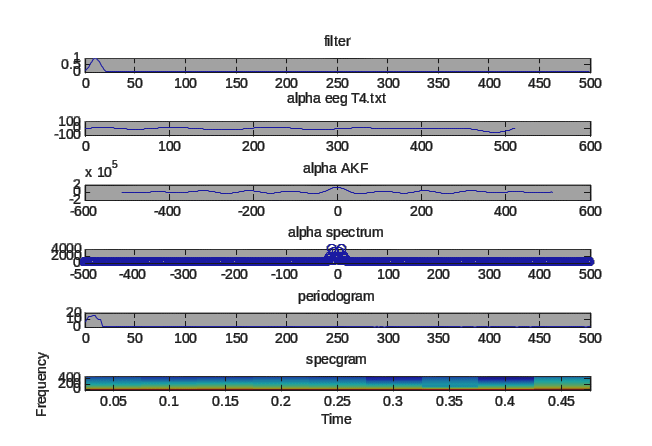 Рисунок 14 – Фильтр альфа-ритма сигнала 'eeg_T4.txt', альфа-ритм, его АКФ, АЧХ, периодограмма и спектрограмма
