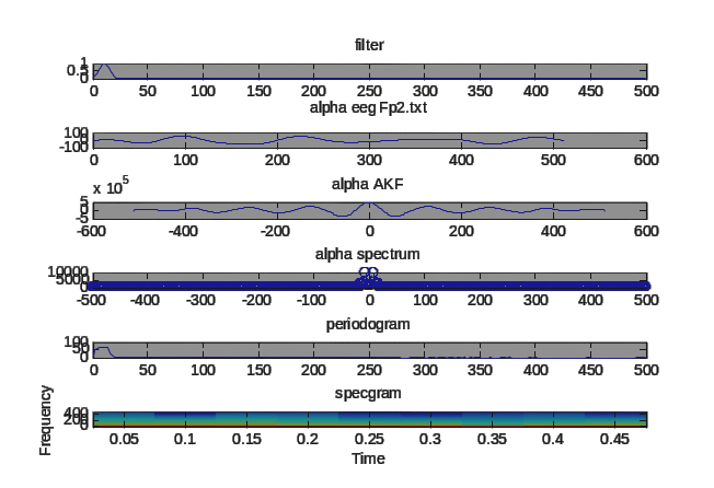 С помощью программы MatLab мы провели обработку единичного сигнала ЭЭГ. Cоздана программа в среде пакета MatLab, и проведен автоматизированный анализ оцифрованных энцефалограмм в частной (частотной) области. Произвелии фильтрацию альфа-ритма всех сигналов, выделили и отобразили АКФ, АЧХ, периодограммы и спектрограммы сигналов и альфа ритмов. Все сигналы в пределах нормы, в некоторых наблюдаются шумы, возможно это связано с аппаратурой или электродами.