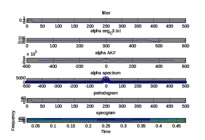 Рисунок 15 – Фильтр альфа-ритма сигнала 'eeg_C3.txt', альфа-ритм, его АКФ, АЧХ, периодограмма и спектрограмма
