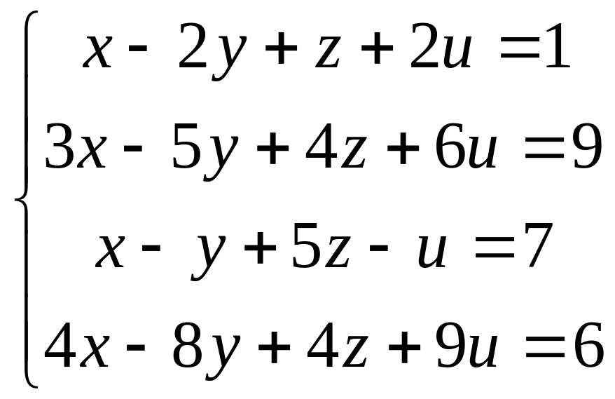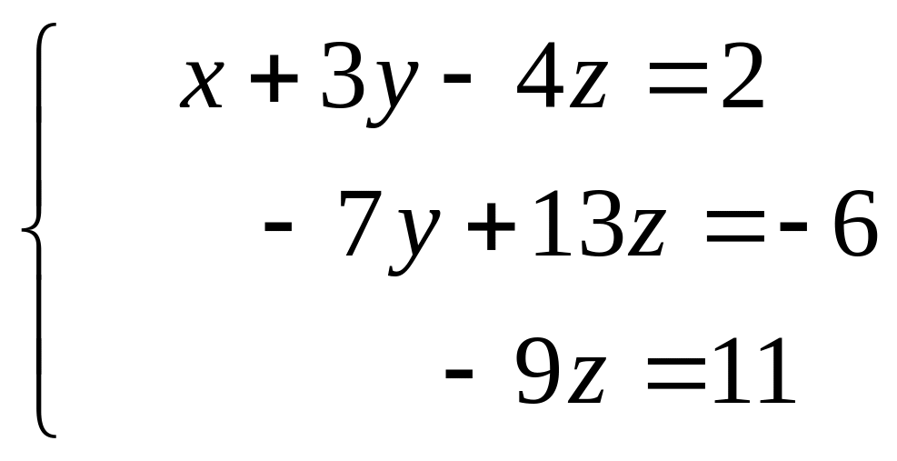 Матрица приведена к треугольной форме (столбец правых частей не считается). По матрице восстановим систему:
