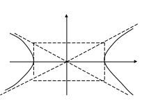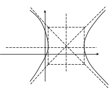 Отмечаем центр гиперболы, пунктирными линиями переносим в нее оси координат, строим прямоугольник, проводим в нем диагонали и вписываем две ветви гиперболы.