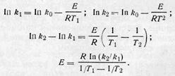 в координатах in k—1/Т есть уравнение прямой. Тангенс угла наклона прямой tg ᵩ дает значение E/R, а отрезок, отсекаемый прямой на оси ординат, равен In k0. Расчет можно произвести и аналитически. Для этого измеряют константу скорости при двух различных температурах Т1 и Т2 и суммируют выражение для Ink: