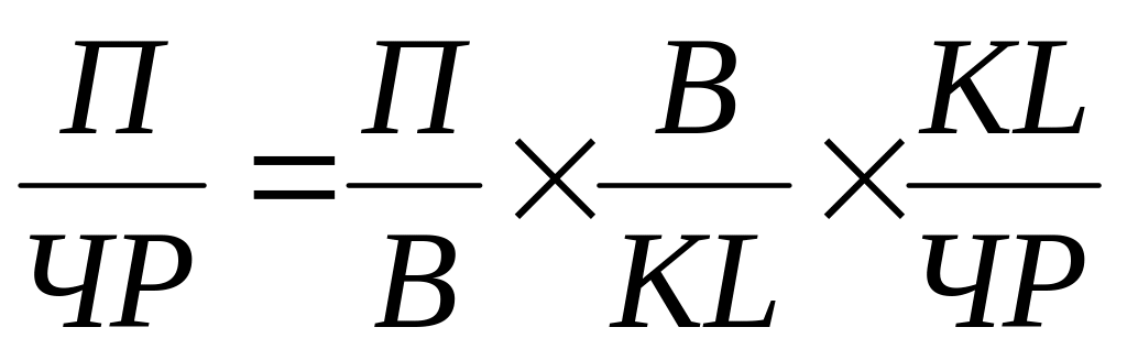 где П - прибыль от реализации продукции; ЧР - среднесписочная численность работников; В - выручка от реализации продукции; КL – среднегодовая сумма капитала; ВП - стоимость выпуска продукции в действующих ценах; П/ЧР – рентабельность персонала; П/В (Rоб) - рентабельность оборота; КL/ЧР – капиталовооруженность труда; В/ВП (Дрп) - доля выручки в стоимости выпущенной продукции; ВП/ЧР (ГВппп) - среднегодовая выработка продукции одним работником в действующих ценах.