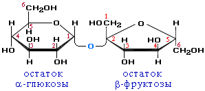 Например, наиболее распространенный в природе дисахарид - сахароза (свекловичный или тростниковый сахар). Молекула сахарозы состоит из остатков глюкозы и фруктозы, соединенных друг с другом за счет взаимодействия их полуацетальных гидроксилов - (1-2)-гликозидной связью: