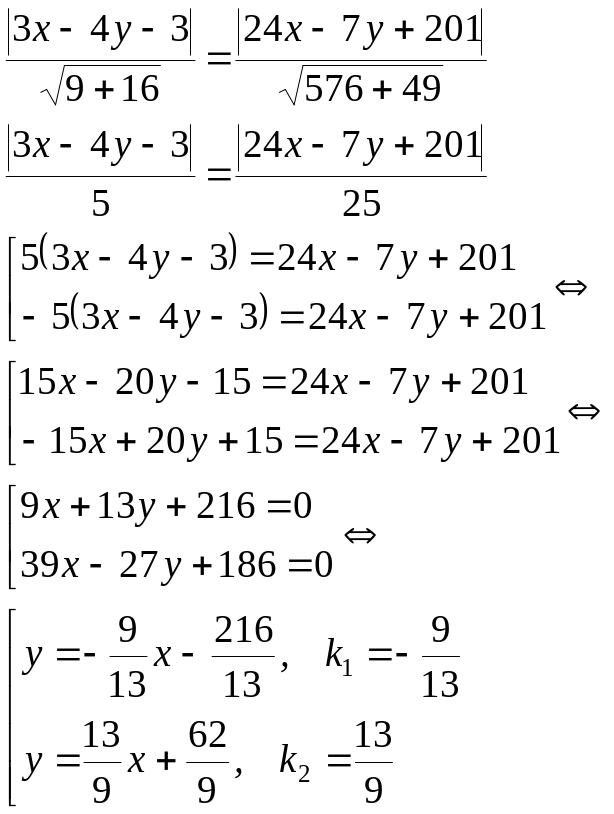 уравнения биссектрисы угла В АВ: 3х-4у-3=0 ВС: 24х-7у+201=0 Уравнения двух биссектрис угла В (внутреннего и внешнего) имеют вид: