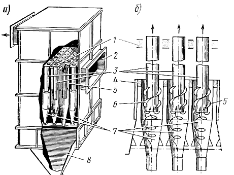 Батарейний циклон (Рис. 3.5.2),виділяє частинки пилу величиною 10-100мкм і складається із декількох малих циклонів. Завдяки тому, що сила з якою частинки прижимаються до стінок циклону, тим більше, ніж радіус циклону, циклони малих діаметрів (при однаковій швидкості V) більш ефективно відокремлюють пил від повітря. Але продуктивність їх зі