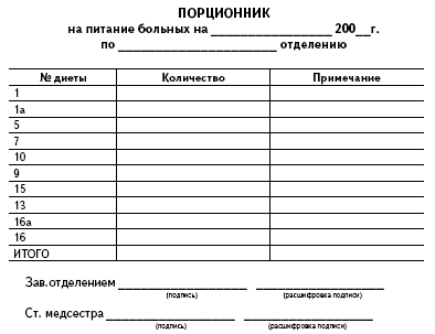 Порционное требование для пищеблока составляет старшая медсестра отделения. Старшая медсестра суммирует порционные требования палaтных медсестер и составляет порционник по форме № 1-84.