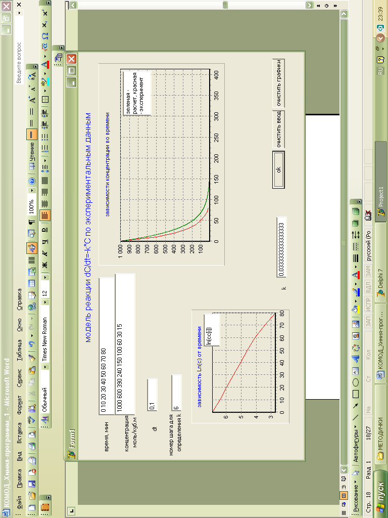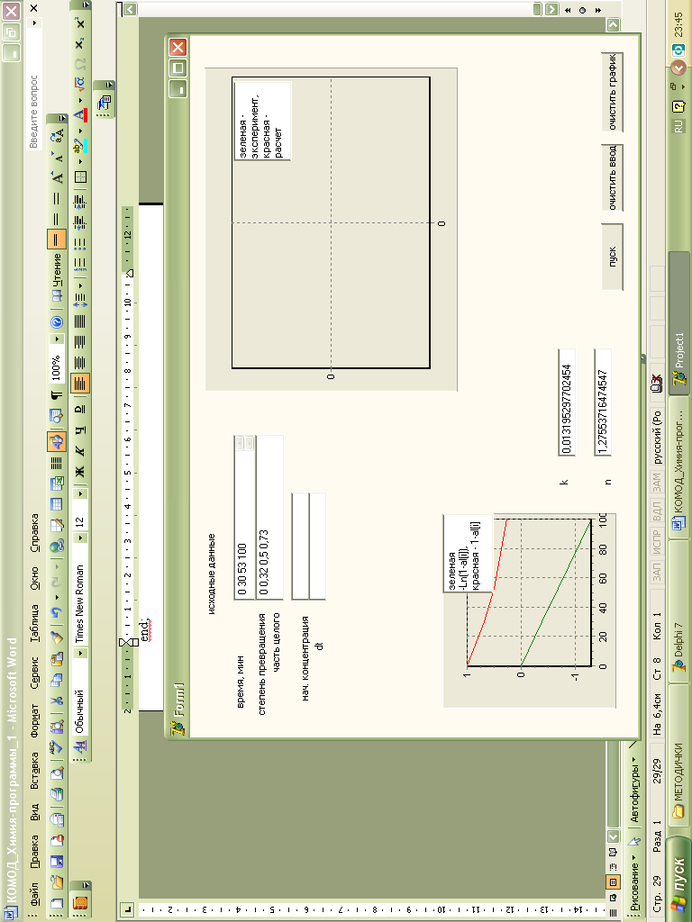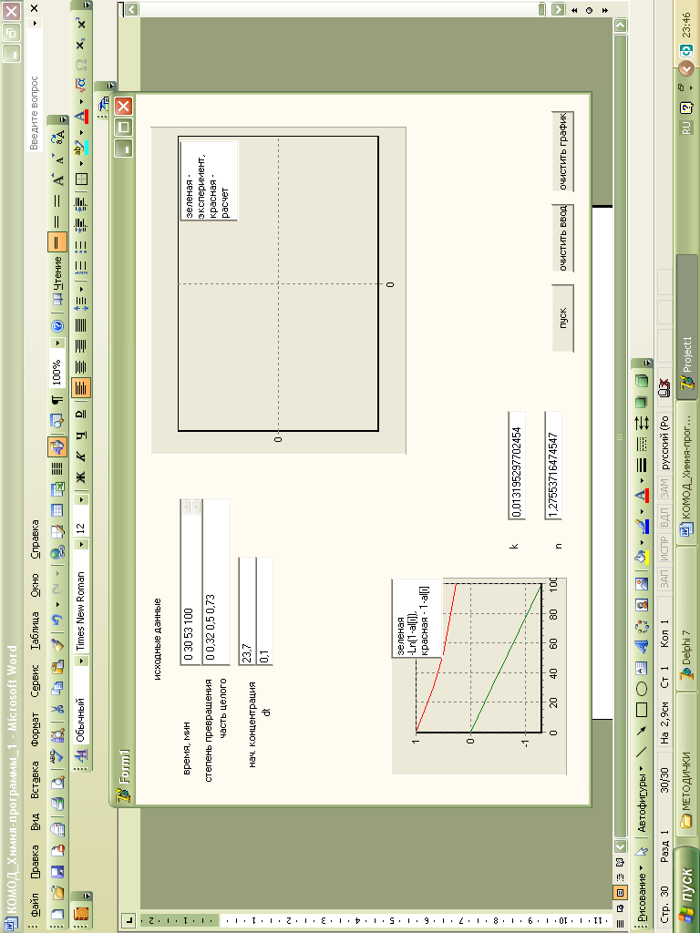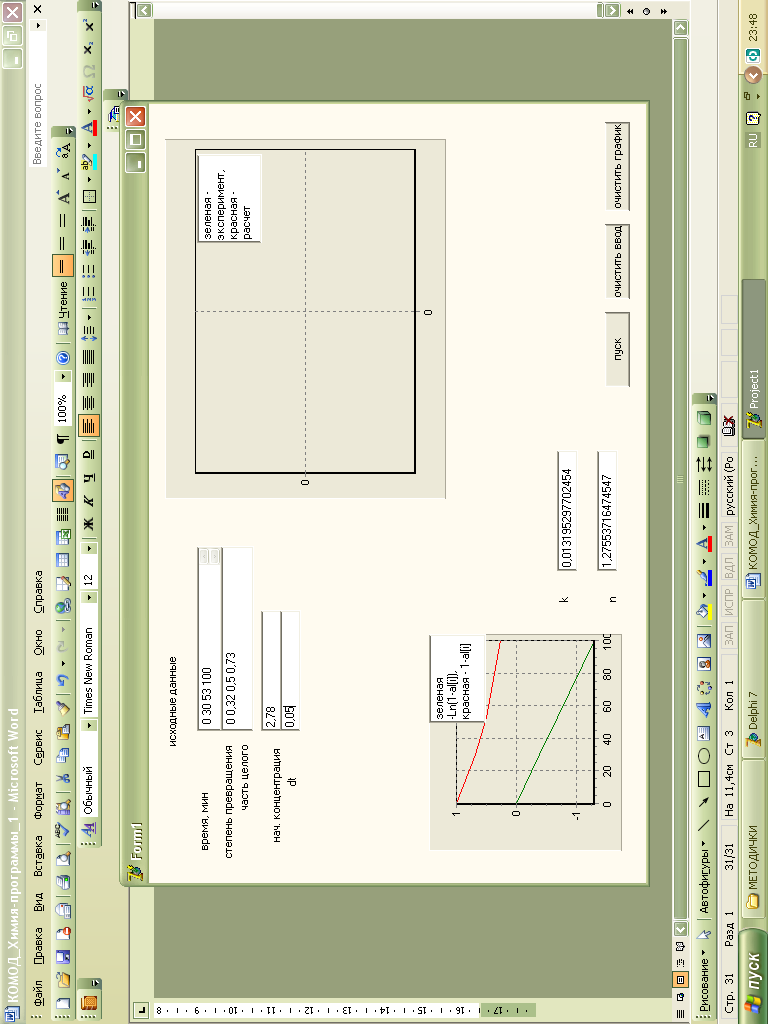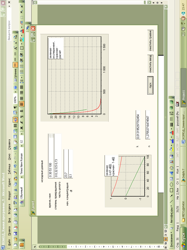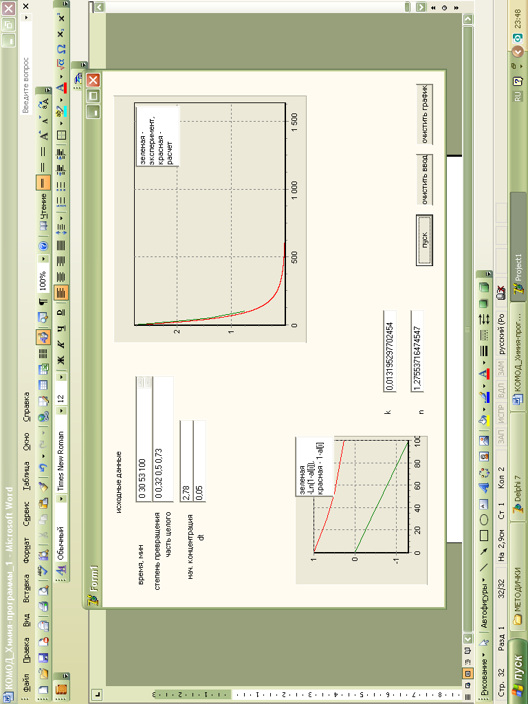 Рис. 28 Окно программы с расчетом константы скорости (k) и порядка реакции (n)