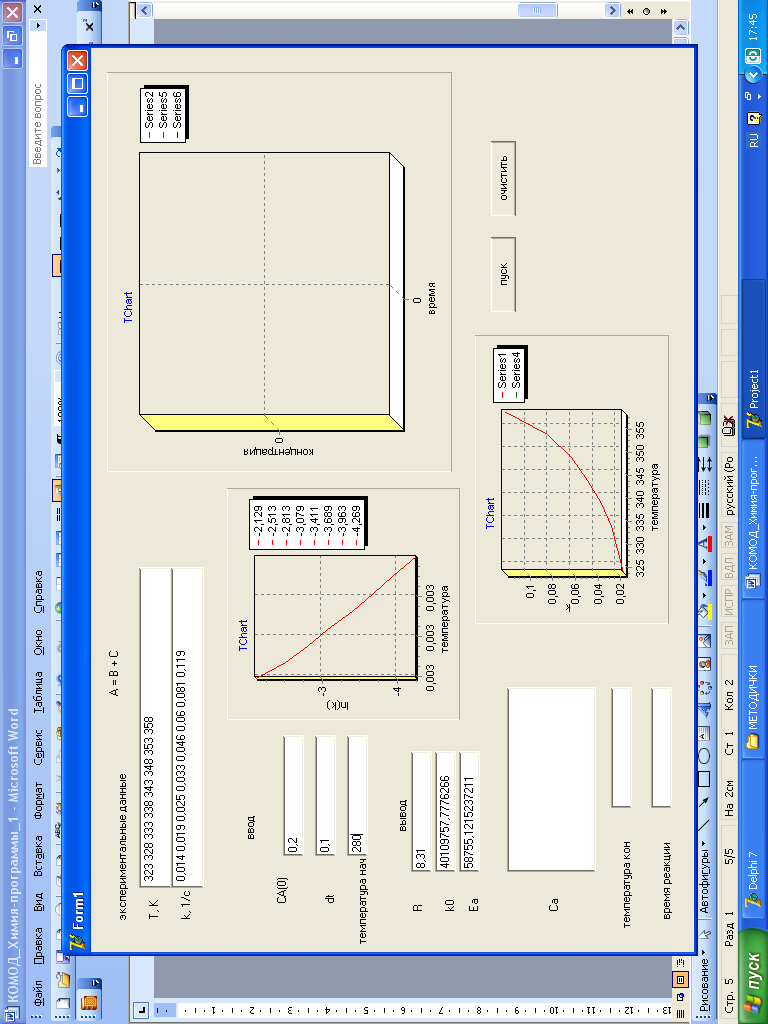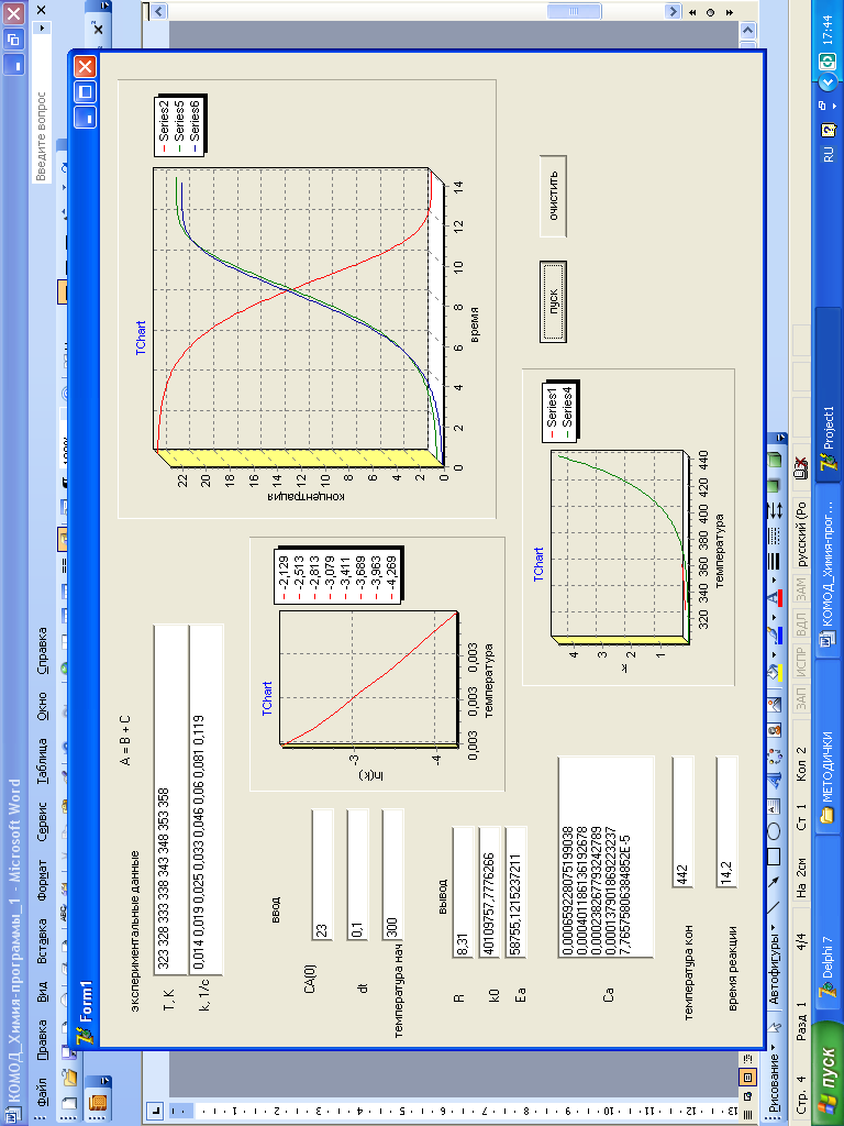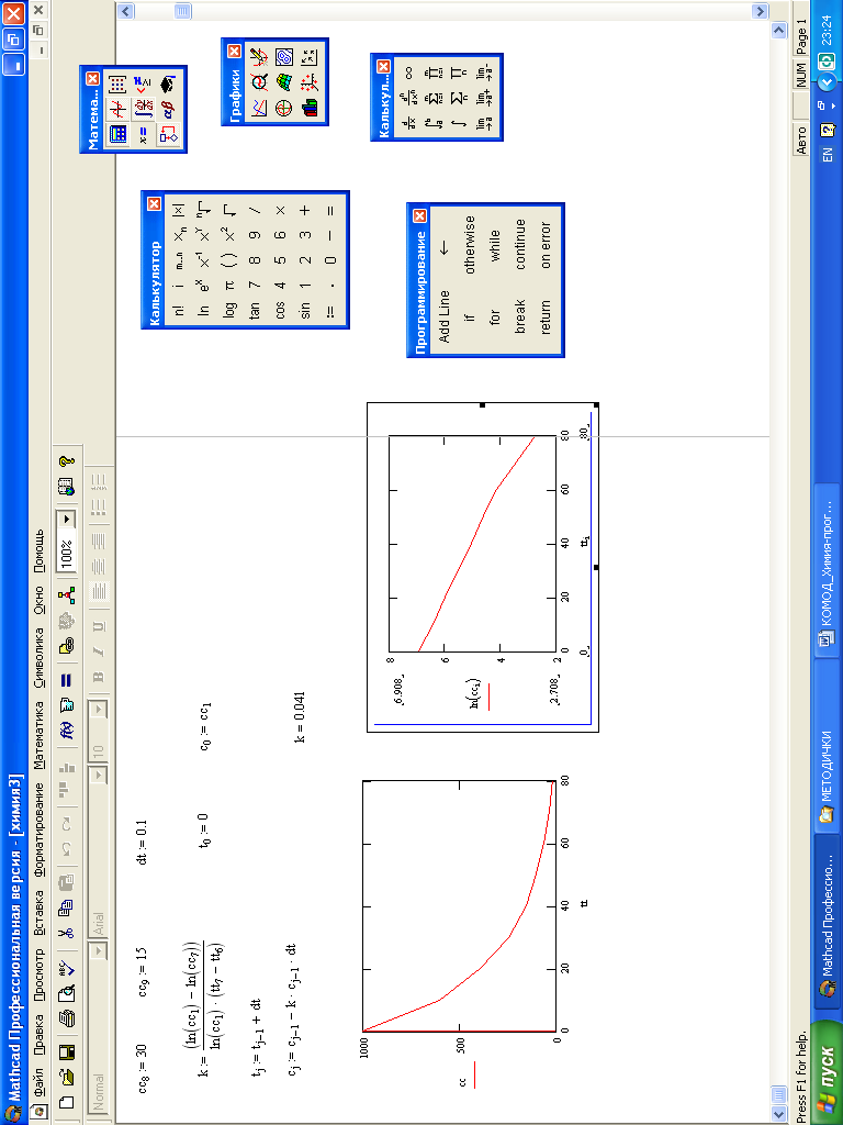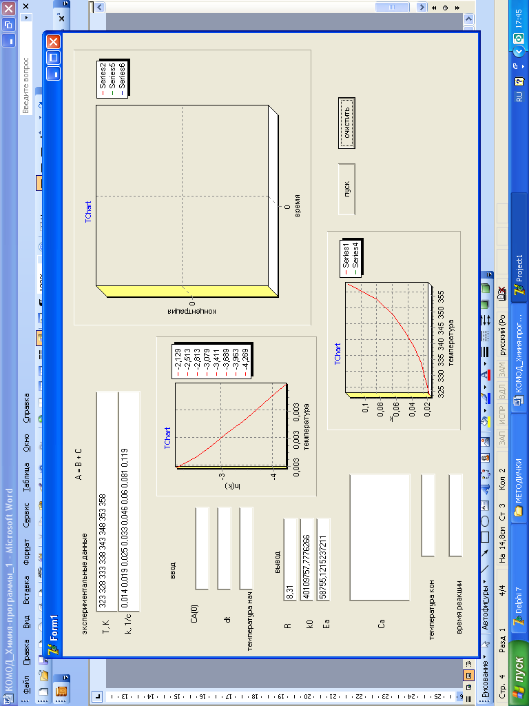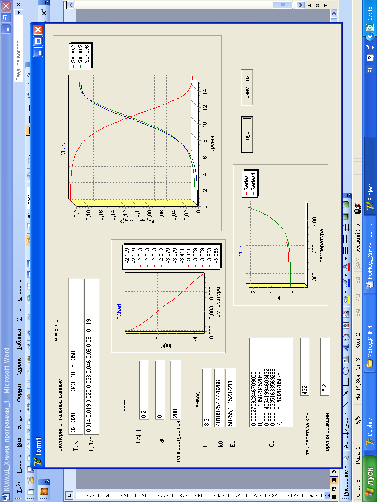 Рис. 28 Окно программы с расчетом константы скорости (k) и порядка реакции (n)
