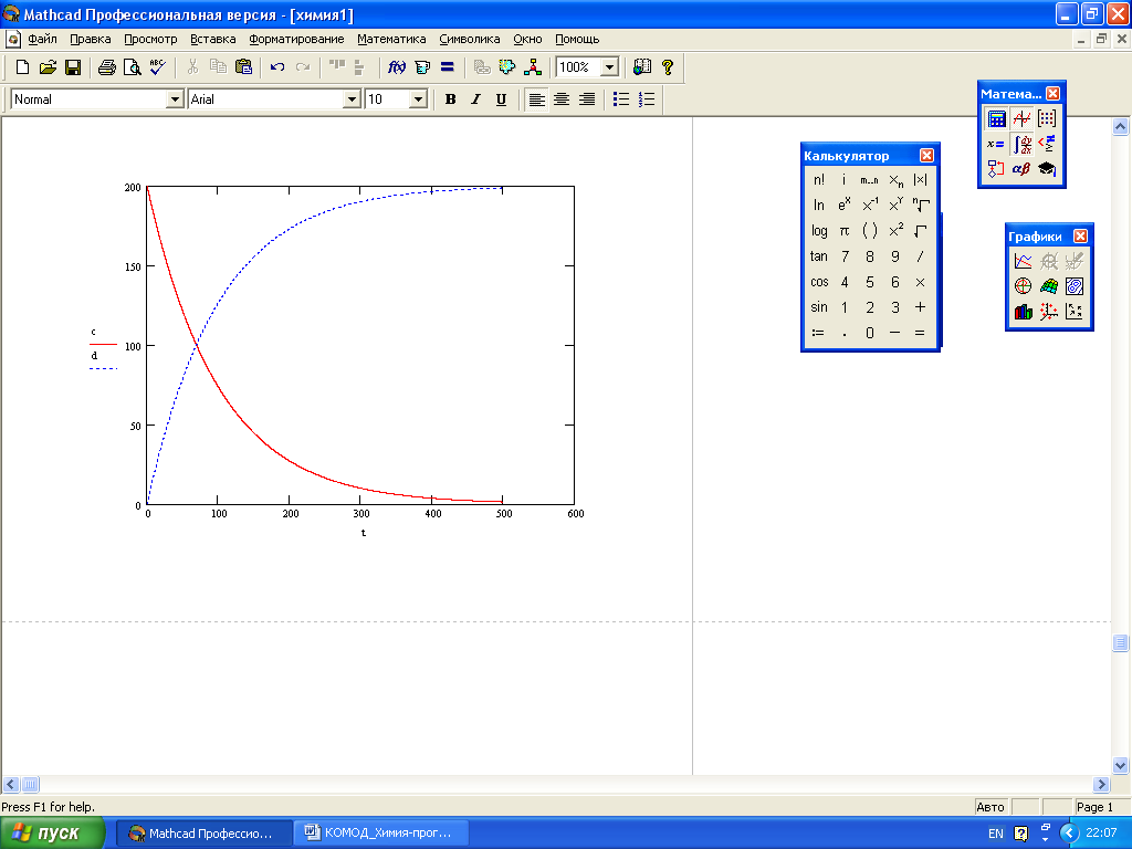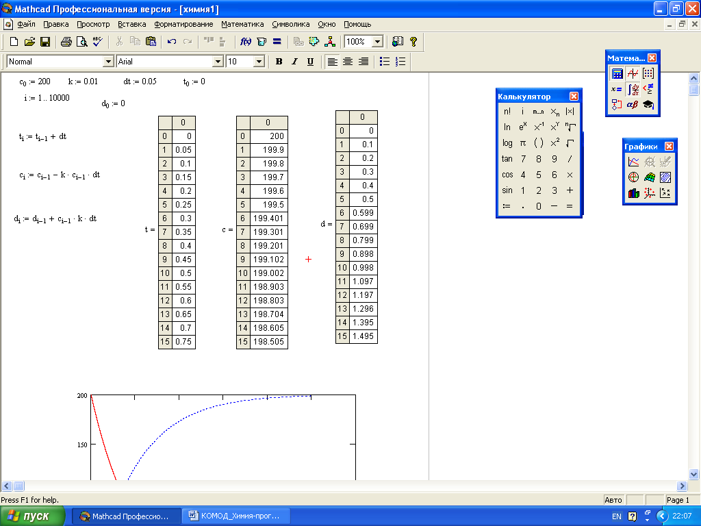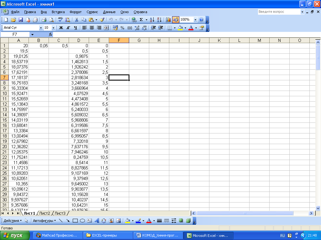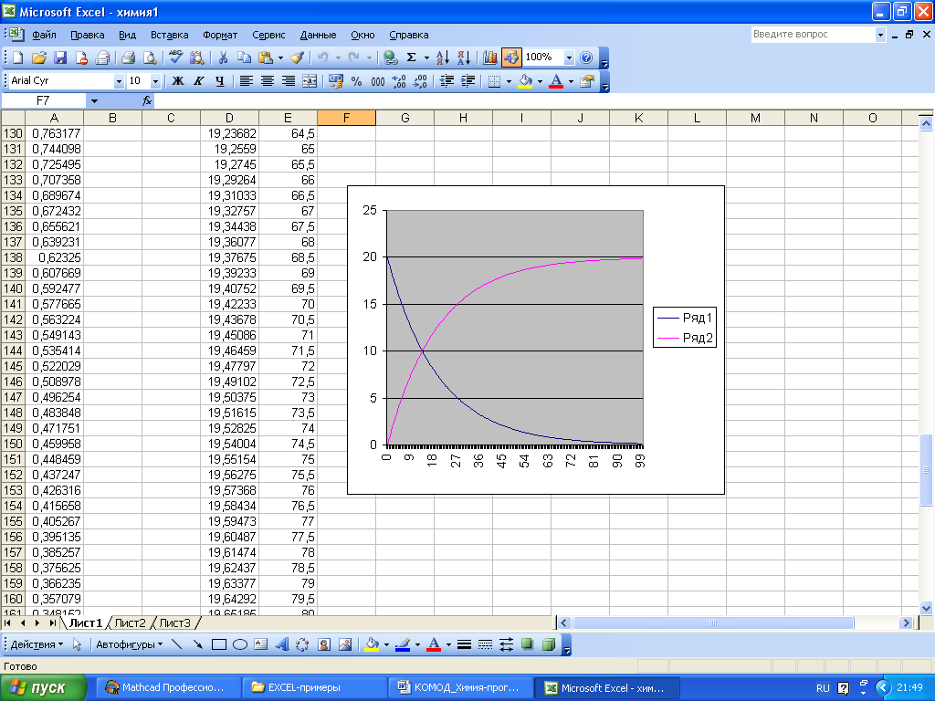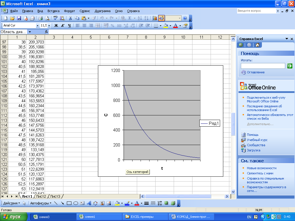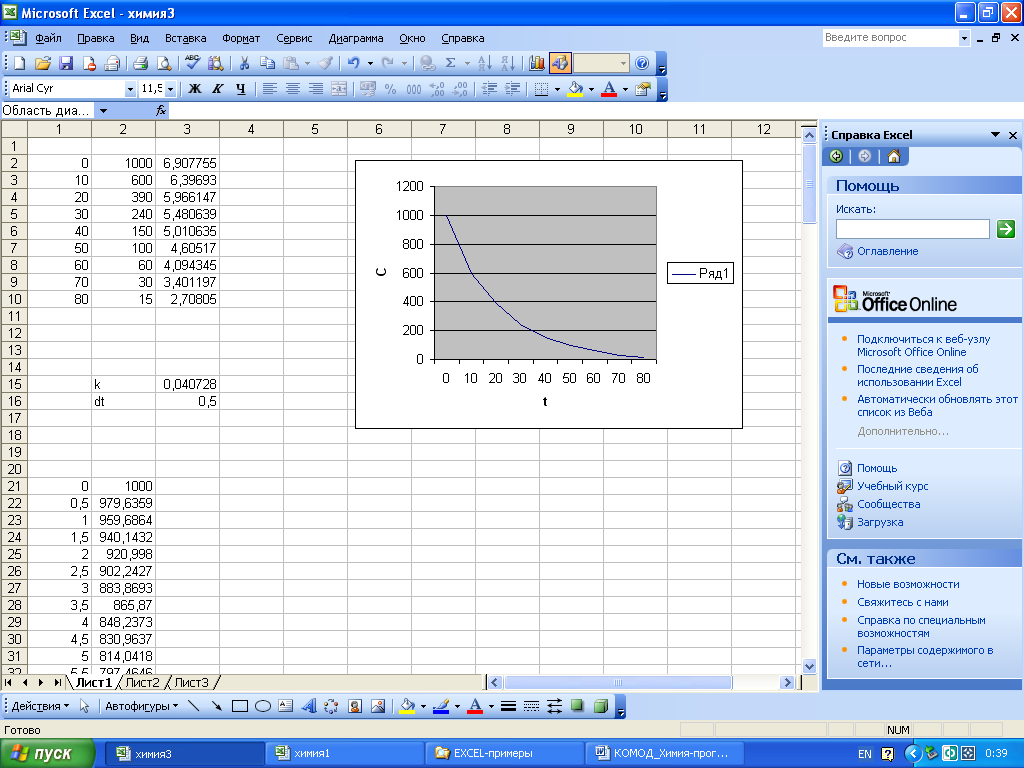 Аналогично предыдущей задаче, моделировать химическую реакцию можно и в excel. Ниже приводятся соответствующие рисунки.