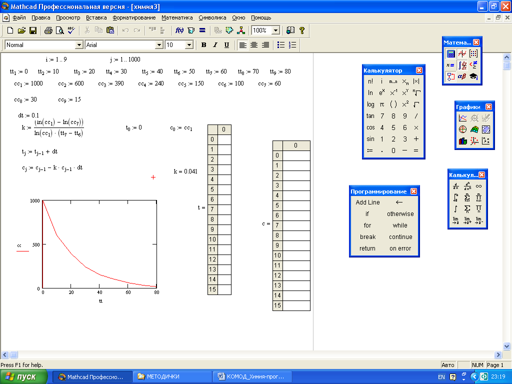 Рис. 22 Файл Mathcad с программой, исходными данными и теоретической зависимостью (ломанная кривая, т.е. – дискретная) зависимостью для определения k