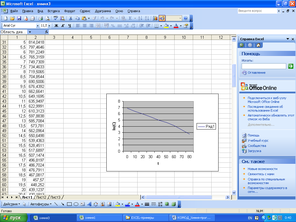 Рис. 25Файл Excel с исходными данными и экспериментальной зависимостью для определения k