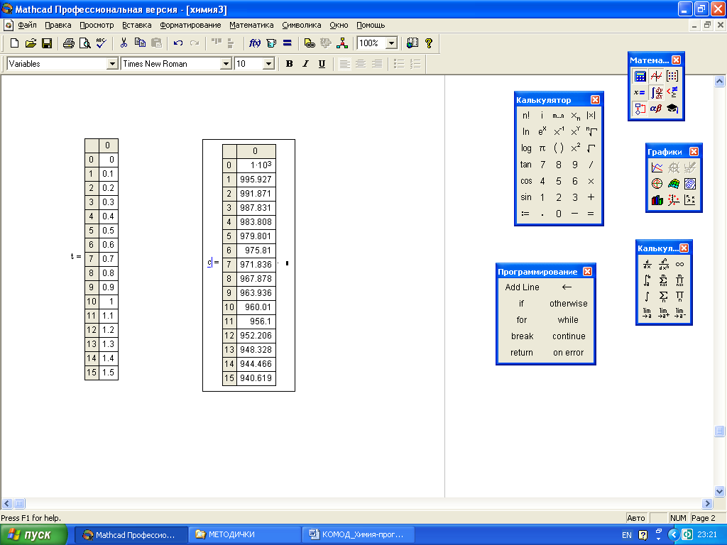 Рис. 20 Файл Mathcad с программой, исходными данными и теоретической зависимостью (ломанная кривая, т.е. – дискретная)