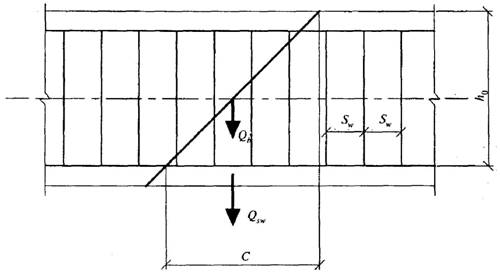 Qsw — поперечная сила, воспринимаемая поперечной арматурой в наклонном сечении.