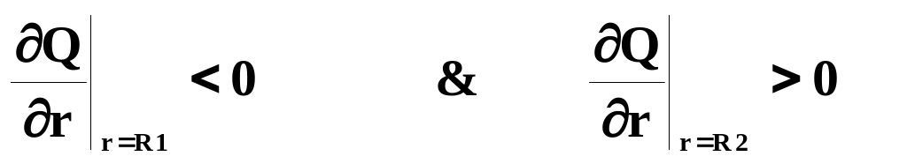то на отрезке (2.3) есть хотя бы одна стационарная точка. Для проверки отношения (2.7) надо найти производную ∂Q/∂R , вычислить ее значение при r=R1 и r=R2 и определить, знаки полученных значений. Если (2.7) выполняется, то используется аналитическая или численная модель в зависимости от существования аналитического решения уравнения (2.6). Если же хотя бы одно из условий не верно, то нужна имитационная модель.